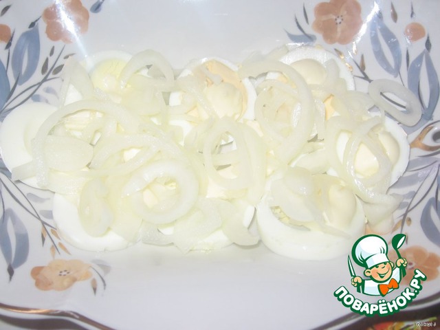 Лук порезать полукольцами, замариновать в уксусе на 10 минут (уксус:вода = 1:1). Это следующий слой, опять соус.