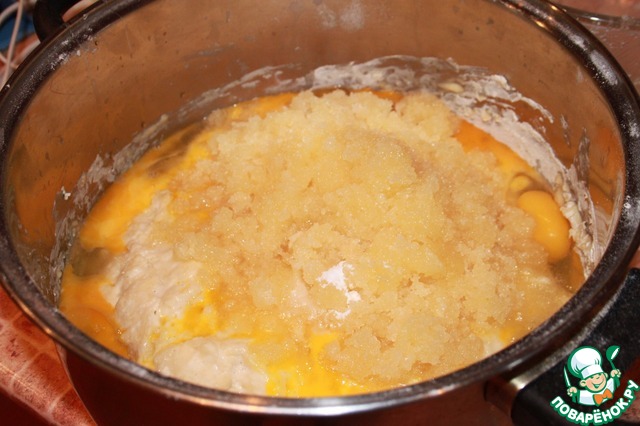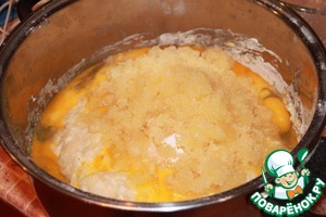 Добавить в опару смесь масла с сахаром,7 яиц,3 столовой ложки подсолнечного масла и ванилин.