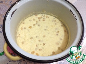 К желткам с сахаром, добавляем молоко, сметану, дрожжи, соль, ванилин, подсолнечное масло, растопленное сливочное масло и изюм. Все хорошо смешать. Белки добавляем в последнюю очередь и хорошо перемешиваем.