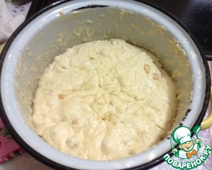 Далее берем что-нибудь, вроде полотенца, ставим на него кастрюльку или миску с тестом, накрываем другим полотенцем и оставляем тесто бродить часов на 10-12, иногда помешивая. Я обычно оставляю на ночь. На картинке уже утреннее фото.