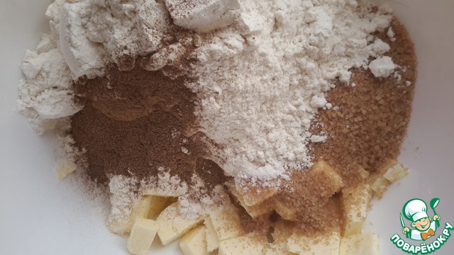 Холодное масло режем кубиками, добавляем сахар, муку и корицу. Руками разминаем до однородной массы.