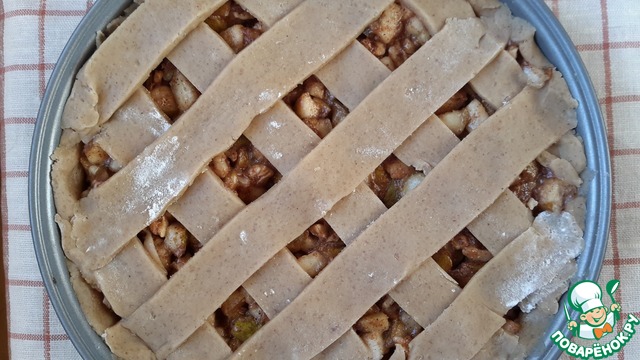Шарик из теста раскатываем в небольшом количестве муки и разрезаем на полосы. Полученные полоски укладываем поверх начинки.