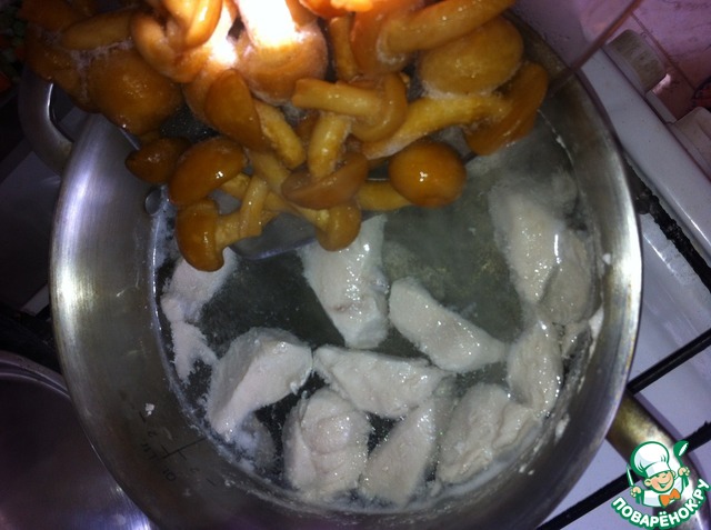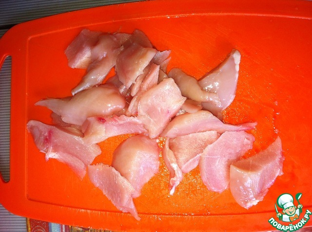 В кастрюлю заливаем 1,5л воды, тем временем нарезаем курицу небольшими кусочками.