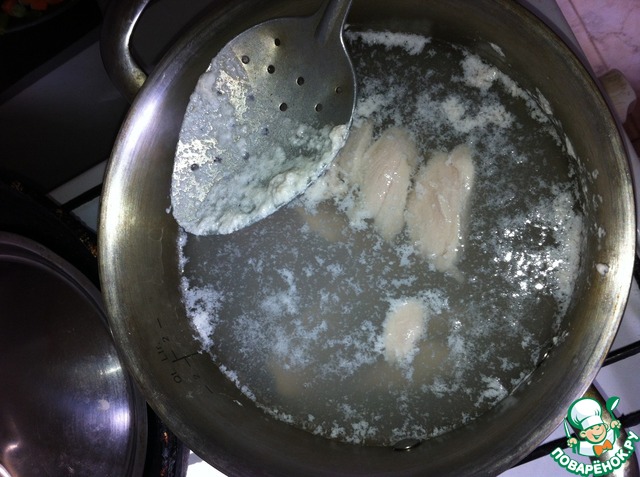 Загружаем курицу в кипящую воду, доводим до кипения, снимаем пену.