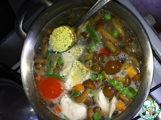 Берем основные составляющие: куриная грудка (можно филе), опята, замороженные овощи, помидор, болгарский перец.