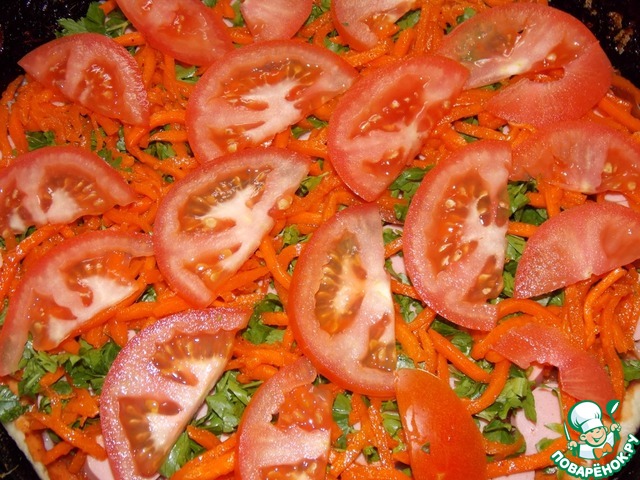 Морковь по - корейски и ломтики помидоров.