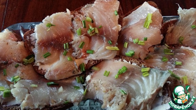 Я сделала из малосольной скумбрии маленькие бутербродики с маслом и черным хлебом.