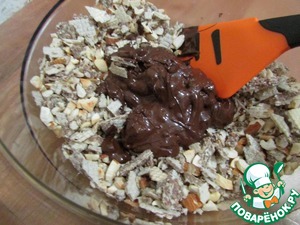 Шоколад с орехами растопить на водяной бане и соединить с ореховой смесью.