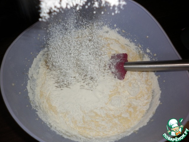 Постепенно, ввести просеянную с разрыхлителем, солью (щепотка) и крахмалом муку. Тщательно перемешать.