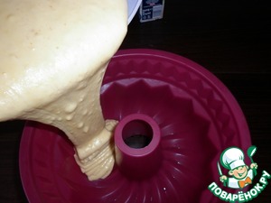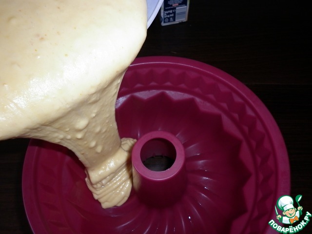 Для этого кекса идеально подходит силиконовая форма "кольцом" (смазывать не надо). При отсутствии таковой, смазать форму растительным маслом и присыпать мукой.