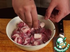 Режем свинину крупным кубиком. Солим, Перчим и добавляем 30 мл. оливкового масла. Хорошо перемешиваем.