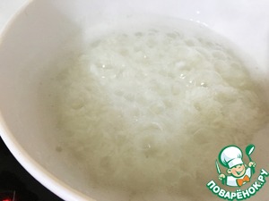 Рис нужно сварить. Для этого в кастрюлю наливаем 2 стакана воды и высыпаем стакан риса, солим. Варим, пока рис не возьмет всю воду. Рис остается слегка недоваренный.