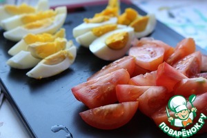 Помидоры и почищенные отварные яйца нарезать дольками.
