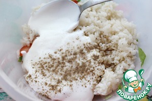 К теплому рису добавить зелень, помидоры, яйца и сметану. Приправить солью и перцем.