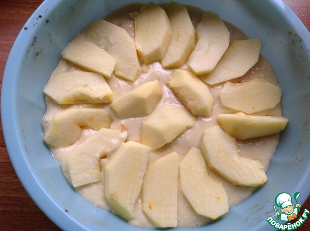 • В форму смазанную растительным маслом выложить тесто. Яблоки очистить от сердцевины и кожуры. Нарезать пластинками не очень тонко (чтобы не горели). Выложить яблочные дольки сверху на тесто и отправить пирог в духовку при 180 гр на 50 мин. Ориентируйтесь на сухую деревянную шпажку. По желанию остывший пирог можно посыпать сахарной пудрой.