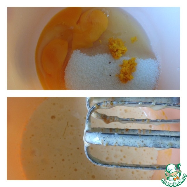 • Яйца взбить с сахаром и цедрой 1 лимона. Влить кефир, сок 1 лимона, и растопленное масло. Взбить.
