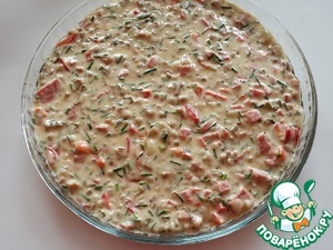 Перемешайте начинку с тестом. Вылейте тесто в смазанную маслом форму и поставьте в нагретую духовку. Выпекайте до сухой спички. У меня это было 25 минут при 180 градусах, ориентируйтесь по своей духовке.