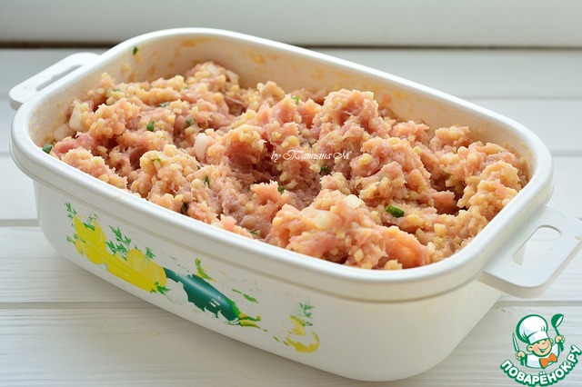 • Пшено соединить с фаршем, добавить яйцо, мелко-рубленные лук и зелень, мускат;