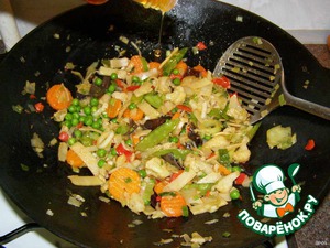 Через пару минут немного капаем кунжутного масла (оно даст аромат китайской кухни) и солим. Еще через пару минут овощи готовы, вынимаем их.