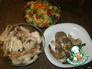Готовится просто и быстро. Мотив очень восточный, даже очень юговосточный, но прекрасно подходит для ужина при свечах, тем более, что морепродукты усиливают... Ну, не стану взрослым девочкам и мальчикам объяснять, что усиливают морепродукты... На фото только готовые компоненты и упаковка от соуса карри. Сервировка, свечи и продолжение - на ваш вкус! Удачи!