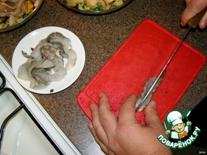 Чистим хвосты креветок и режем их вдоль (потом узнаете зачем).