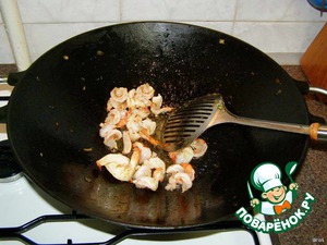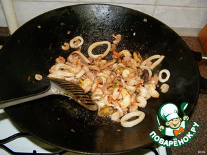Когда спиральки готовы (примерно через минуту), добавляем остальные морепродукты. Не забываем мешать! Напоминаю, огонь должен быть очень сильным (настолько сильным, насколько силен Ваш огонь любви!).