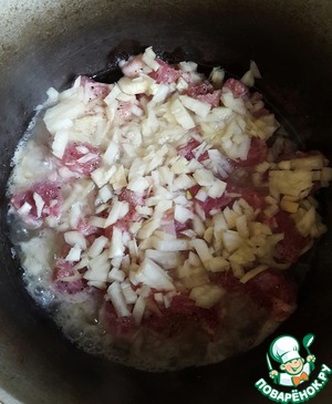 • Мясо жарится. Нарезаем лук и распределяем его на мясо.