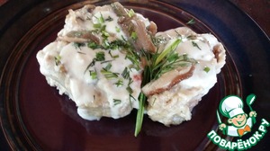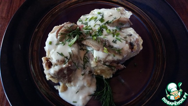 Выложить ленивые пельмени на тарелку, полить оставшемся соусом украсить варенными грибами и зеленью.