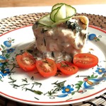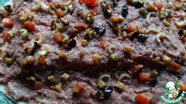 Распределить фарш тонким слоем по лавашу, посыпать сверху баклажанами с томатом и сельдереем.