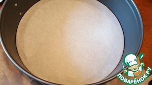 Для удобства проложить бумагой для выпечки дно разъёмной формы d26 см. Можно не вырезать круг, а просто защепить бумагу стенками разъёмной формы.