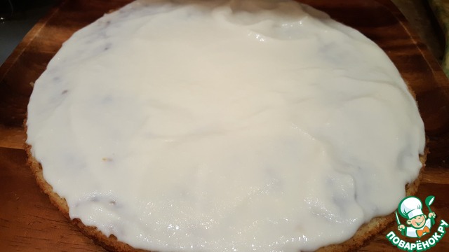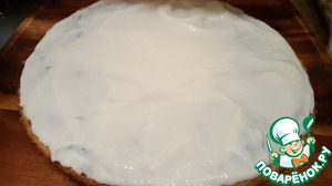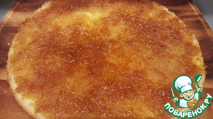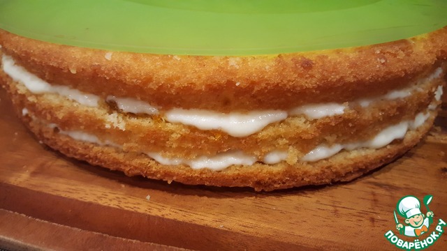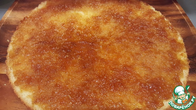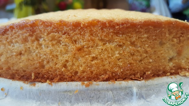 Разрезаем остывший бисквит на 3 части, если сложно, то на 2. Пропитываем нижний корж и средний сиропом, наносим его равномерно на корж лопаточкой.