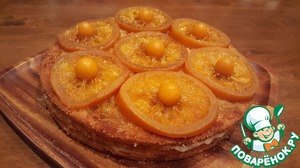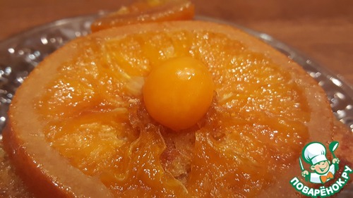 В серединки кладём помытые ягодки физалиса. Можно положить вишню или любой орешек, по Вашему настроению. Поливаем остатками сиропа, в котором варились кружочки, пространства между апельсинами и немного сверху, если хватит. Отправляем торт в холодильник до утра.