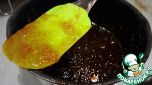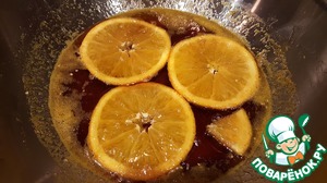 Пока бисквит остывает сварим сироп для пропитки коржей. Добываем сок из одного громадного, как у меня или 2х средних апельсинов и снимаем с них цедру, если вместе с соком отделилась мякоть используем и её, только без белых перегородок. Засыпаем сахаром и варим около 10минут, может немного дольше до состояния как на фото. Вкус у нашего сиропа получается как у английского мармелада.