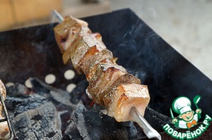 Нанизывать на шампур поочередно печень и сало, как можно плотнее друг к другу. Сало должно быть по краям. -