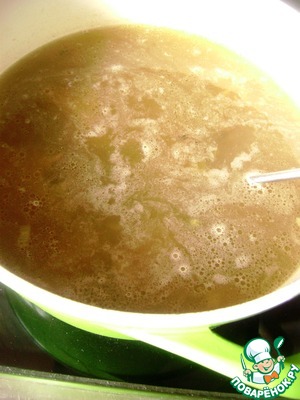 Мясо промыть, нарезать небольшими кусочками размером со спичечный коробок, залить холодной водой и поставить варить. После закипания тщательно снять пену, добавить целую луковицу, убавить огонь до минимума и варить почти до готовности мяса. Бульон процедить, лук выбросить.
