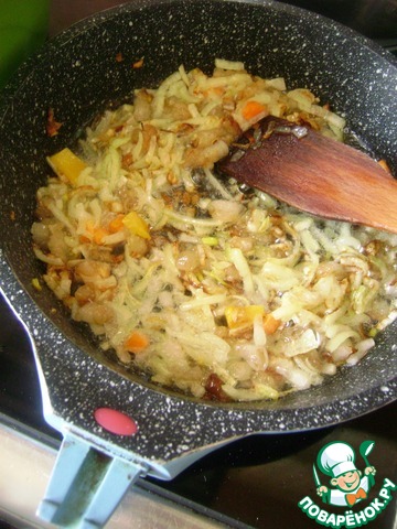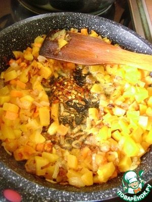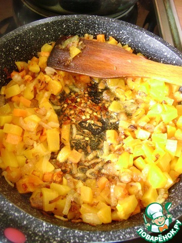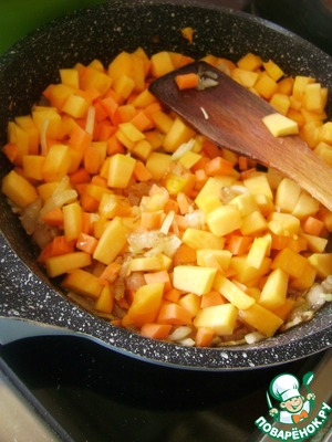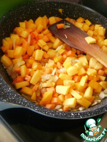 Добавить морковь и тыкву, убавить слегка нагрев и жарить до мягкости, особо не зарумянивая.