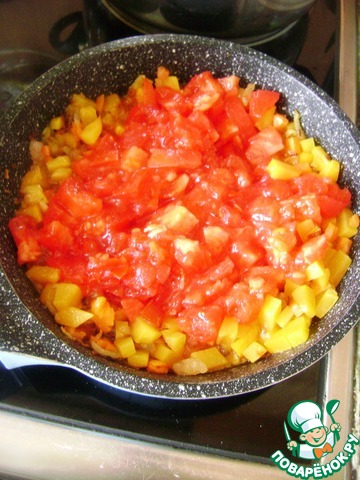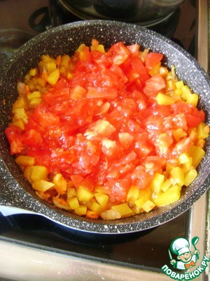 Добавить помидоры и тушить, помешивая, до испарения жидкости и окрашивания жира в оранжевый цвет.