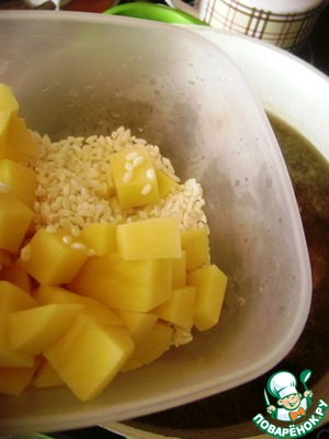 Когда маш станет почти мягким, опустить в кастрюлю картофель и промытый рис. Посолить. Суп должен быть густым. Варить до готовности картофеля.