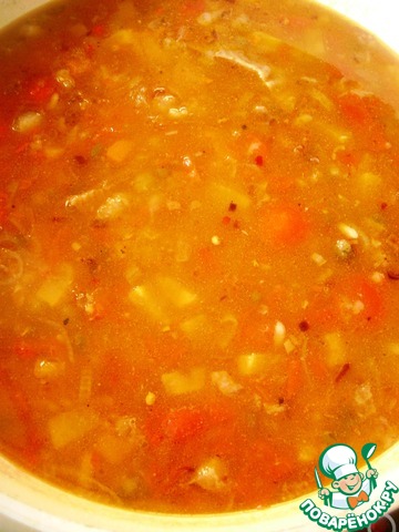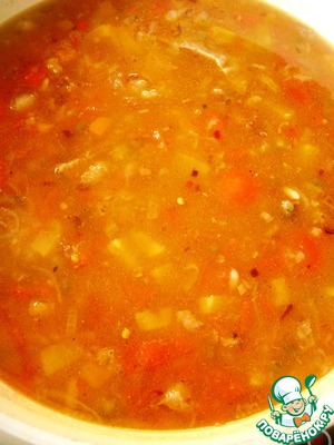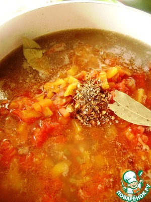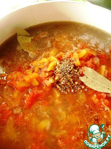 Выложить в суп овощную пассеровку, добавить лавровый лист и свежетолченый перец с кориандром.