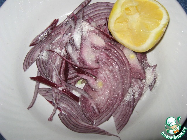 Лук нарезать тонко полукольцами, добавить сахар, соль, сок лимона, перемешать. Мариновать минут 10-15.