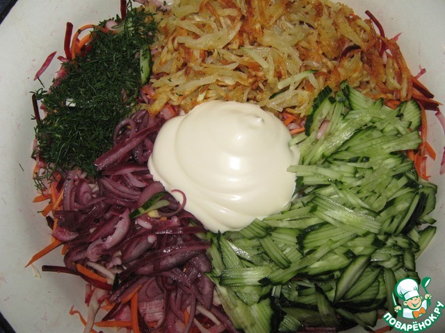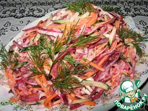 Капусту мелко нашинковать. Свеклу (сырую), морковь, редиску натереть на корейской тёрке. Посолить, перемешать