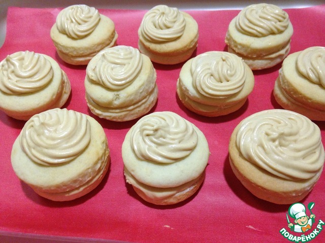 Собрать печенье. Нанести начинку, скрепить две половинки, обмазать края печенья и обвалять в кокосовой стружке.