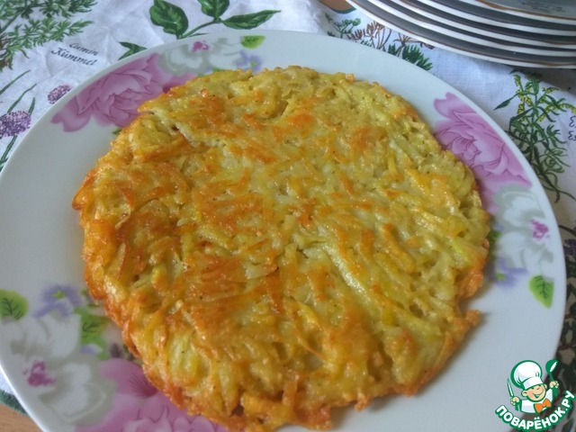 Рёшти – это такой большой швейцарский «драник» величиной со сковороду. Традиционное крестьянское блюдо в кантоне Берн. Как всякая народная еда, рёшти знает множество вариантов приготовления. Отличаются они в основном наполнителем. Логика проста: что оказалось под рукой, то и наполнитель. Мы использовали твердый сыр. А вообще, рецепт позволяет использовать в качестве наполнителя не только сыр — например, тыкву, лук, лосось, бекон. А вместо муки можно использовать крахмал (кукурузный или картофельный). И главное - не пережарьте рёшти!