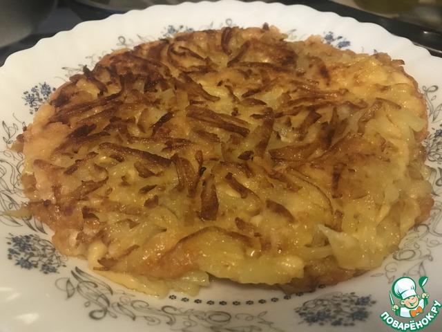 В глубокую сковороду щедро налить растительного масла (или растопить сливочное), хорошенько разогреть. Выложить рёшти одним блином, жарить с двух сторон на среднем огне до готовности.