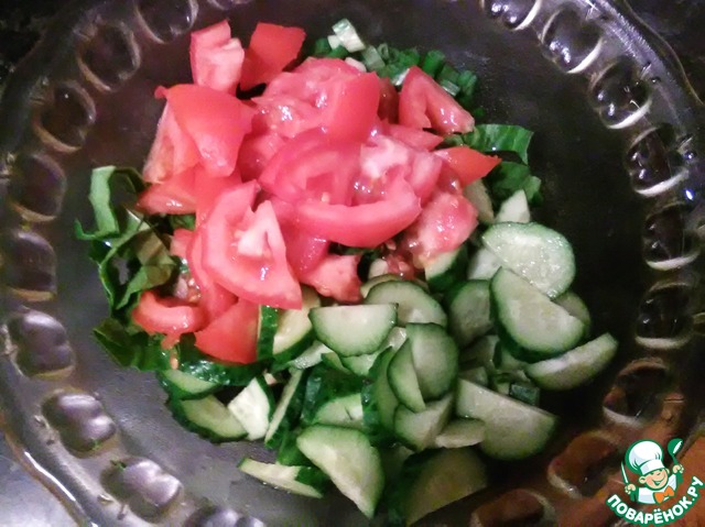 Произвольно нарезаем помидоры и огурцы