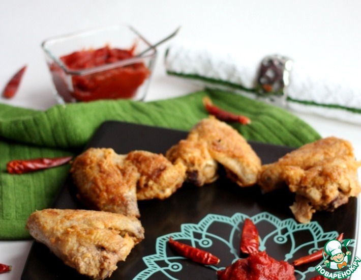 Крылышки обвалять в смеси муки с перцем, потом в яйце, потом опять в муке с перцем. -
