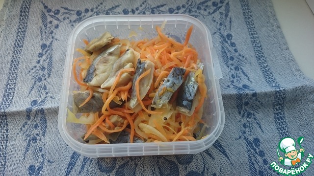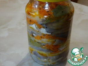 В литровую банку выкладываем будущую закуску слоями: лук, рыба, лук, морковь и т. д. Хорошенько утрамбовываем, сверху выливаем оставшееся масло со сковороды. Если жидкость не покрыла всю рыбу и овощи, приминаем сверху и добавляем масло. Если все делали правильно и пропорции сохранены, то лишнее масло не потребуется.