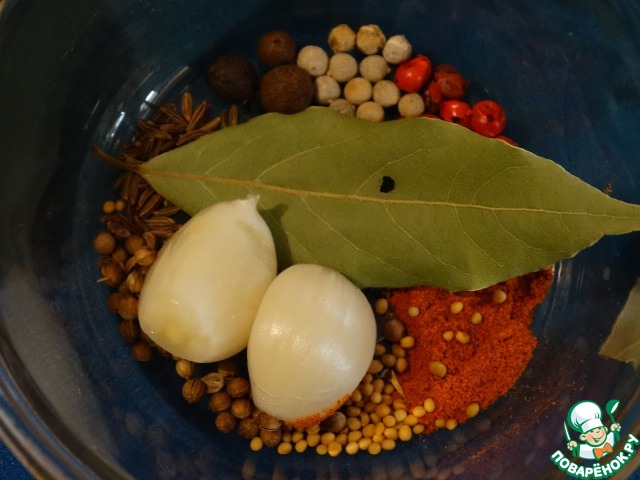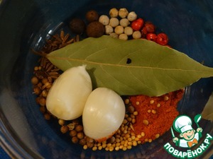 Собираем все необходимые специи в отдельную плошку: все перцы, кориандр, паприку, лавровый лист, тмин и чеснок.