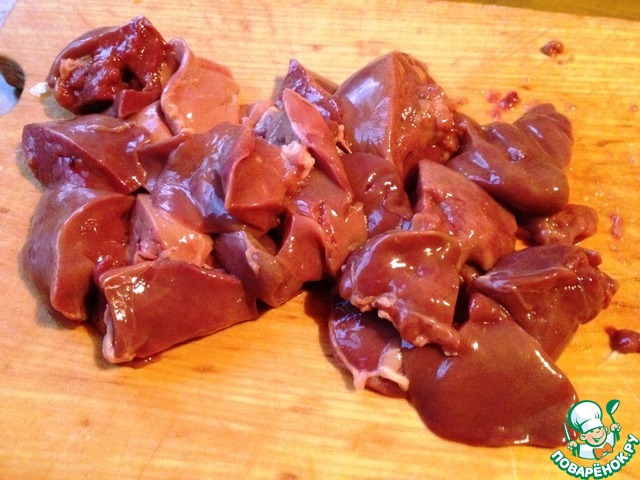 • Печень вымыть, обсушить, нарезат небольшими кусочками.