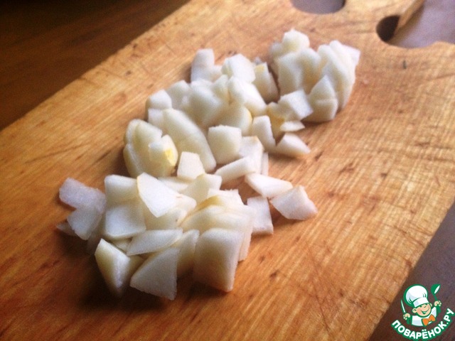 Яблоко и груши промыть, обсушить, очистить от кожуры и сердцевины и нарезать кубиками.
